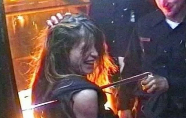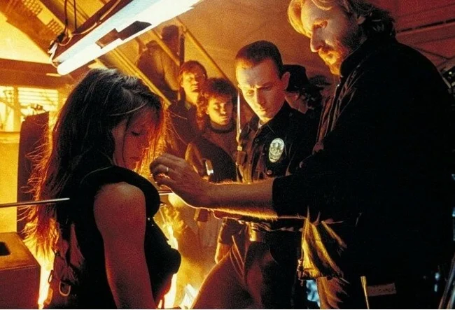 Джеймс Кемерон показує, як правильно потрібно протикати плече Сари Конор. Звичайно ж, штир не проходить крізь актрису, оскільки складається з двох частин, одна з яких розташована ззаду, а друга одягнена на палець.