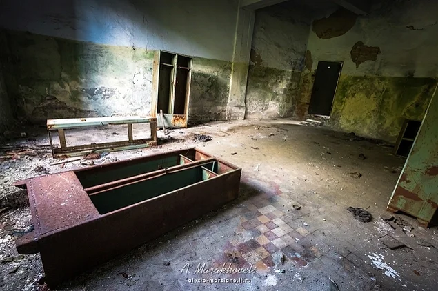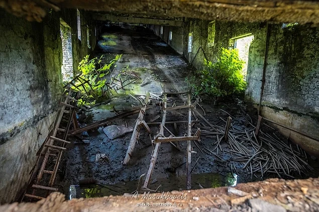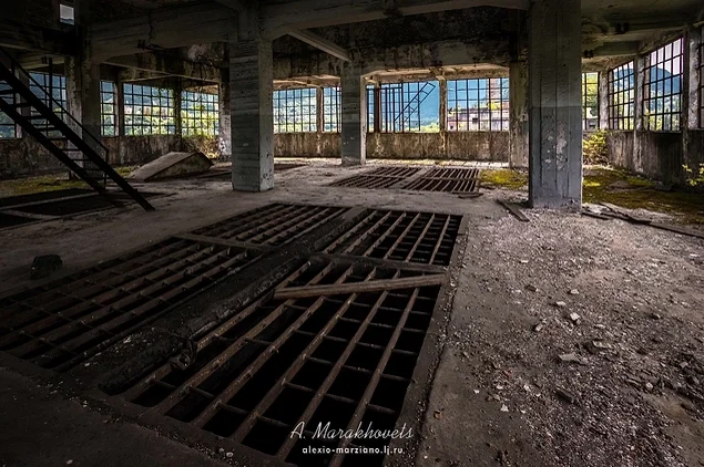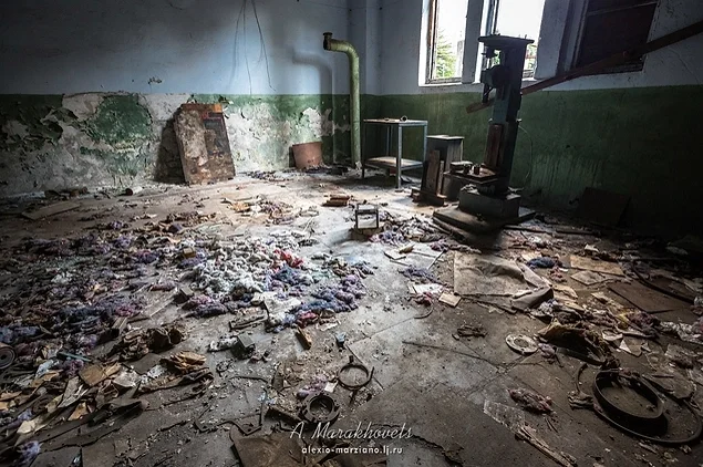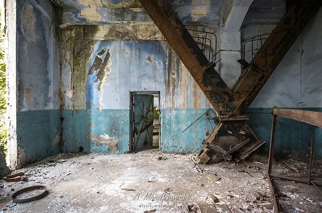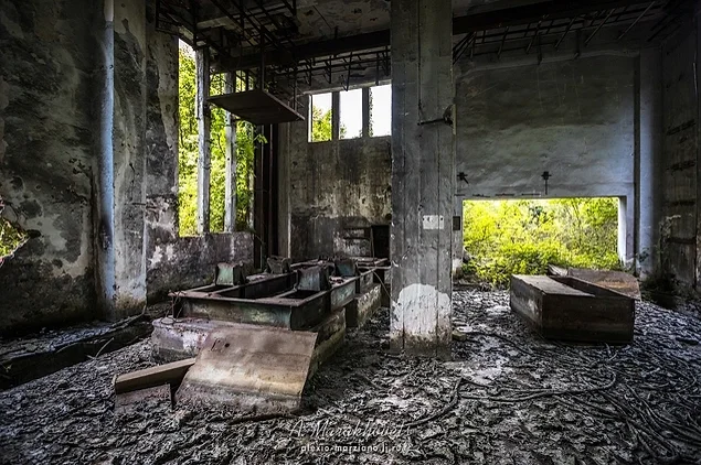 13. Усередині будівлі можна побачити уламки розбитих вікон, стіни у графіті, та обладнання, покрите іржею.