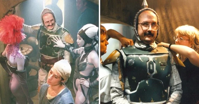 А ось і той самий актор - Джеремі Буллок. Погодьтеся, його зовнішність набагато краще підходить загадковому найманцю в шоломі. До речі, нижче в кадрі ми ще раз бачимо Девіда Проуза, котрий зіграв Дарта Вейдера.