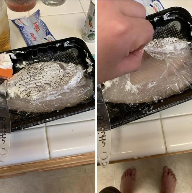 17. Моя дівчина готувала курку: вона натерла її спеціями та сметаною, але забула зняти упаковку ![]()