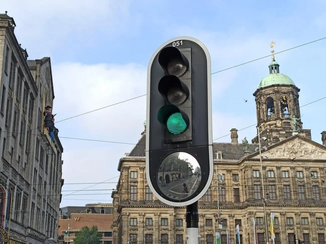 Світлофор із дзеркалом, що дозволяє водіям бачити пішоходів/велосипедистів, що знаходяться в їх сліпих зонах