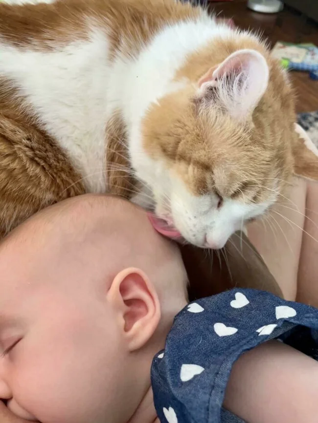 23. "Чому мій кіт, який у мене вже 10 років, лиже мою дитину? Він не лиже моїх старших дітей (4 і 6), але я не можу привчити його перестати лизати немовля"