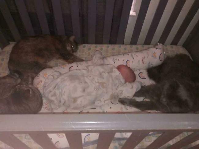 6. "У нашої кішки народилися кошенята через кілька днів після народження нашої дитини. Одне кошеня постійно забирається в колиску. Їм судилося стати найкращими друзями"