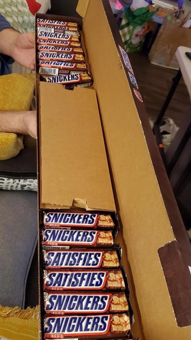 Цю коробку продають, як «метровий снікерс», хоча збоку написано точну кількість батончиків.