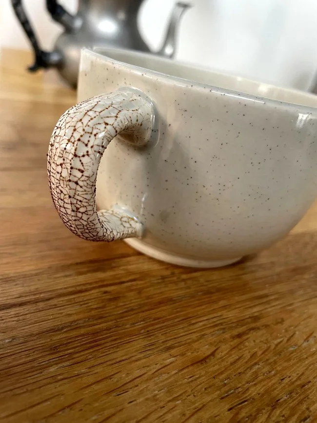 Глазур на цьому керамічному кружку потріскалася через регулярне теплове розширення, тому напій почав просочуватися через тріщини всередині кружки і виходити зовні в області ручки. Звичайно, і сама якість кераміки підводить, тому що якісна кераміка не повинна бути пористою. Подвійна підстава: втрачаєш каву і брудниш руки.