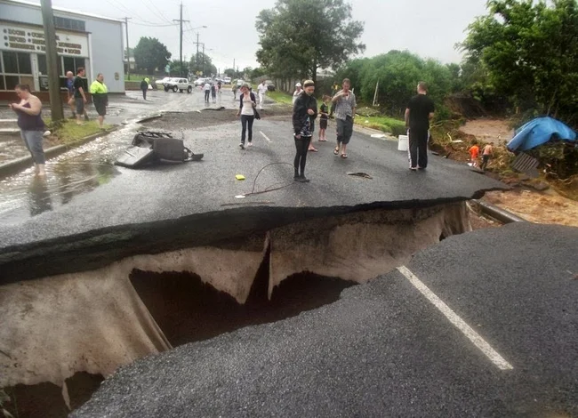 Місцеві жителі оглядають дорогу, яка впала під час повені в Тувумбуї, місті на захід від Брісбена, 10 січня 2001 року.