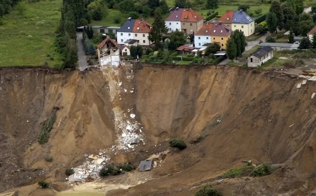 Уламки житлового будинку та зруйнована дорога у селищі Нахтерштедт, де 18 липня 2009 р. утворився величезний провал. Троє мешканців досі вважаються зниклими безвісти.