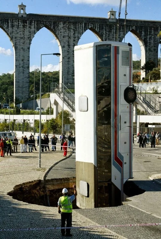 Рятувальники витягують автобус краном із провалу у Лісабоні, 25 листопада 2003 року.
