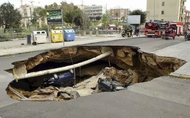 Автомобілі у провалі, що утворилося внаслідок обвалення дороги до системи підземних печер у південному італійському місті Галліполі, 30 березня 2007 року.