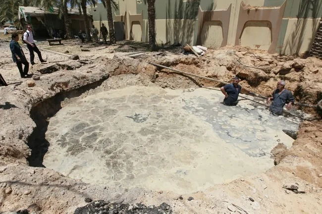 Воронка, яка, за словами лівійської влади, утворилася внаслідок авіаударів коаліції, видно в районі комплексу Баб аль-Азізія у Тріполі 12 травня 2011 року.