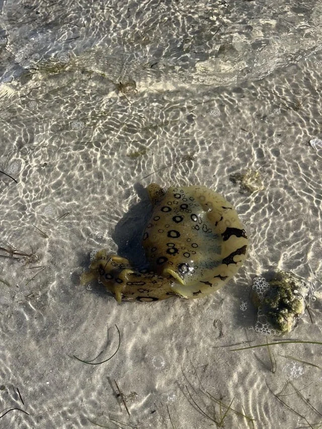 Схоже на плямистого морського зайця, різновид морського слимака. Нешкідливі для людей, але можуть виділяти чорнило як захист.