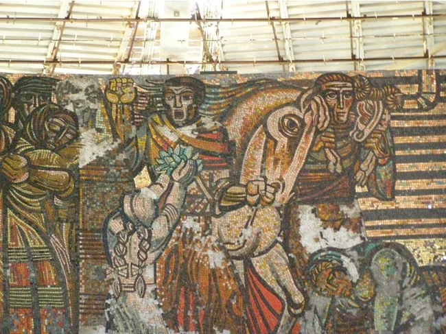 Мозаїчні панно поступово руйнуються, але де-не-де картини ще можна розрізнити.