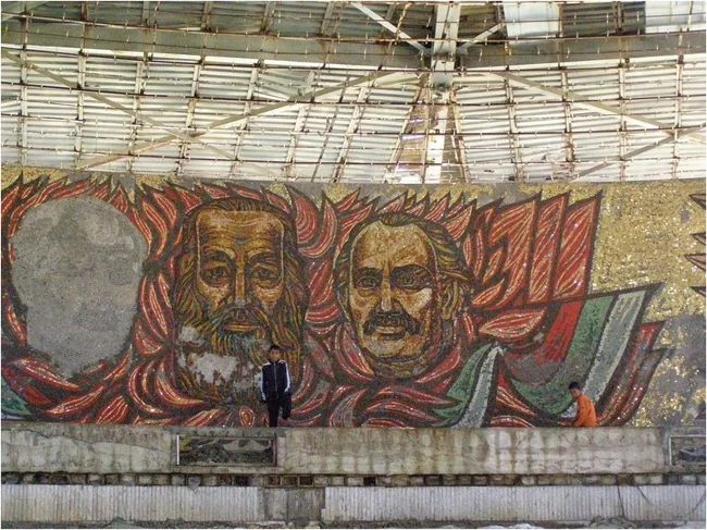 Мозаїки нагадують про мистецтво перших років радянської влади.