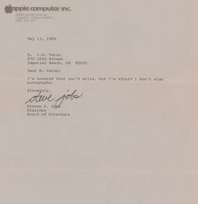Стів Джобс відповів на прохання про автограф підписаним листом, в якому говорилося, що він не дає автографи.