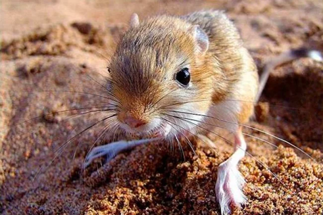 Смішний карликовий тушканчик Козлова. У нього велика голова та довгі лапи.