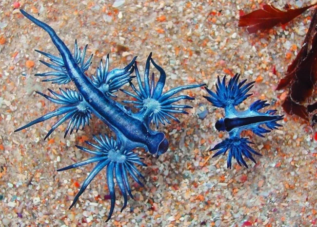 Блакитний дракон плаває синім пузом нагору, через що хижаки його не помічають. А сам він харчується медузами, причому обов'язково отруйними, адже цією отрутою він потім захищається.