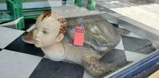 Важко сказати, яку ідею намагався реалізувати автор через свій витвір. Але, судячи з наклейки, шанувальник таланту знайшовся і купив цю суміш людини та черепашки.