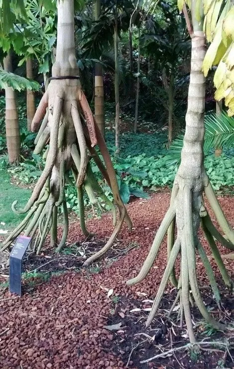 Свою назву пальма отримала за незвичайне коріння, яке починається в декількох десятках сантиметрів над поверхнею землі і входить у ґрунт, нагадуючи ноги.