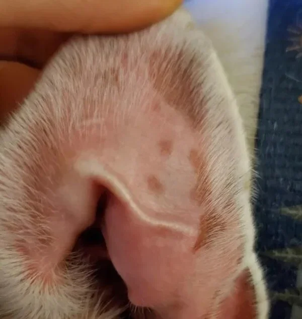 "Малюнок у вусі мого собаки схожий на обличчя з усмішкою"