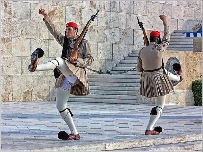 Ну і закінчимо почесною грецькою варти, що охороняє могилу Невідомого солдата в Афінах. Їхню форму складно назвати військовою, як і рухи, далекі від звичної багатьом військової дисципліни. Але, напевно, свою пряму місію вони виконати зможуть.