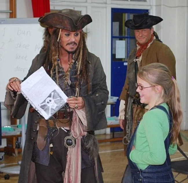 Депп без попередження з'явився у школі у повному костюмі Джека Горобця, але порадив не бунтувати. Він обійняв дівчинку і сказав: "Можливо, сьогодні нам не слід влаштовувати заколот, бо на вулиці за мною стежить поліція".