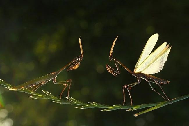 Навіть у справах любовних комахи вкрай галантні. Суперничаючи за самку, самці намагаються вирішувати питання мирним шляхом. Виглядає така дуель вкрай потішно: пацани пижаться один на одного, розмахуючи крилами та лапками.