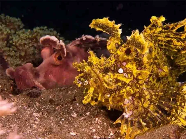 Дві приблизно рівні за силою особини можуть деякий час жити поруч. Поки що одна з них не ослабне. В даному випадку наш герой сидить із рибою-скорпіоном з іншого виду.