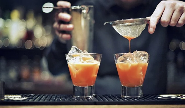 На дно ллють сироп, потім алкоголь, а після сік зовсім трохи перемішують до красивого градієнта.