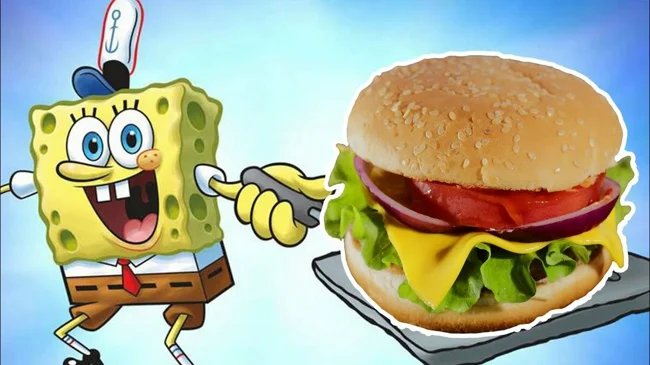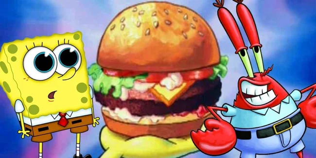 Уважні глядачі спостерігали, як Губка Боб готує фірмову страву, що мало чим відрізняється від будь-якого бургера. По суті, ніякого секрету немає: булочку з кунжутом нарізають навпіл, туди кладуть просмажену котлетку з фаршу.