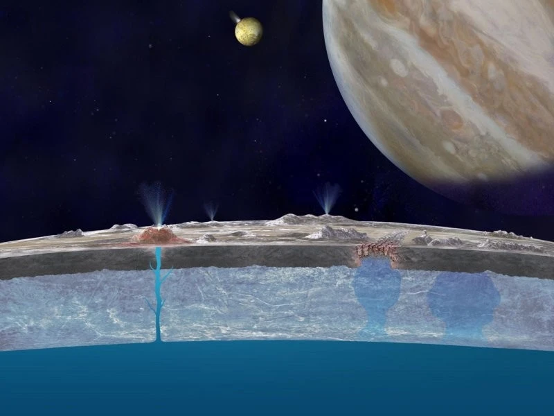 Крім того, життя планують шукати під товстим прошарком льоду Європи. Відомо, що під ним є океан. Водяна піна виходить із тріщин у південній полярній області і на Європі є помаранчеві розлучення по всій поверхні.