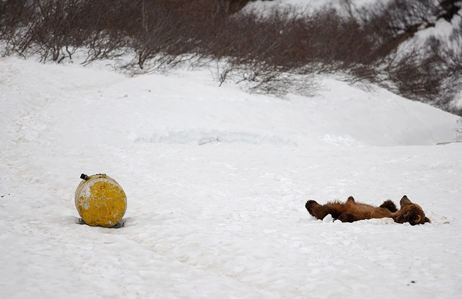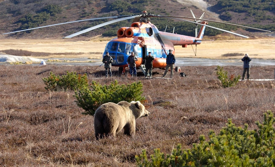 Бурий ведмідь очікує відльоту гелікоптера, щоб нанюхатися залишків палива на місці його посадки.