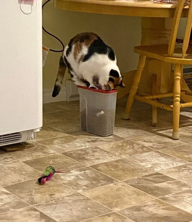 У неї повна миска, але вона все одно намагається дістатися всього корму