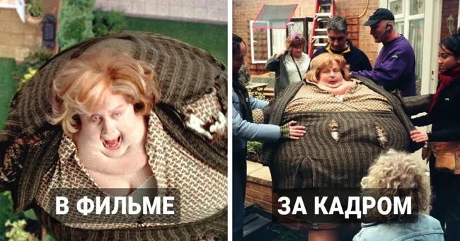 Актрису Пем Ферріс одягли у величезний костюм роздутої Марджорі Дурсль і за допомогою тросів піднімали її у повітря для зйомок моментів, де вона відлітає вгору.