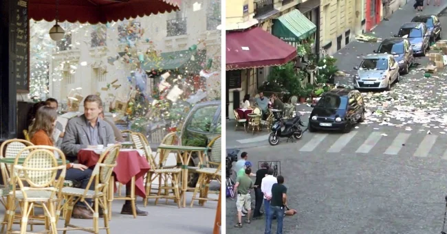 Намети, що розлітаються, з овочами і фруктами були красиво сповільнені для фільму, але знімальна група нічого не малювала, а дійсно організувала серію міні-вибухів прямо на вулиці.