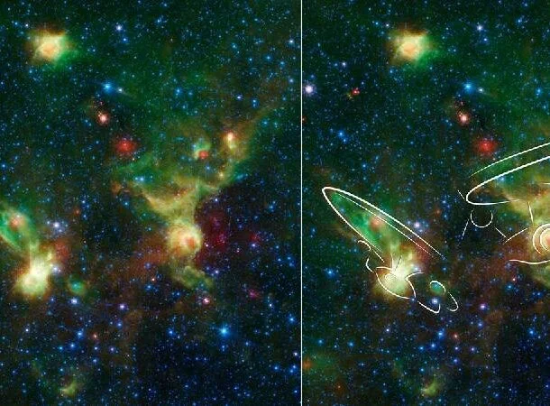 Нещодавно НАСА поділилося чудовим знімком двох туманностей — або областей народження зірок, — зробленим космічним телескопом «Спітцер». Вчені, очевидно, знаються на деталях, оскільки їм якимось чином вдалося ідентифікувати космічну матерію, яка явно нагадує зореліт «Ентерпрайз». Щоб довести, що ці хлопці справжні ботаніки, вони випустили знімок 8 вересня, коли, власне, і відзначалося 50-річчя «Зоряного шляху».