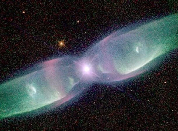Променисті «крильця» на фотографії - це останнє світло зірки, що вмирає, після викиду її зовнішніх шарів. Астрономи виявили, що дві зірки у туманності M2-9 мають приблизно таку ж масу, як і Сонце. Коли велика зірка наближається до кінця свого життя, її менший партнер — високорозвинений білий карлик.