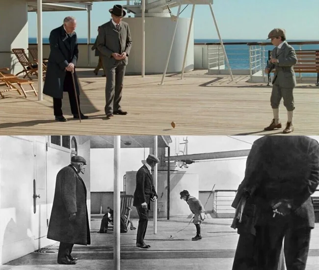 Джеймс Кемерон всіляко намагався зробити свій фільм 1997 року "Титанік" якомога історичніше точним. Ця сцена у фільмі ґрунтується на реальній фотографії, зробленій на борту "Титаніка" до краху. На ній зображено пасажира першого класу Фредеріка Спеддена і його шестирічного сина Дугласа, який грає з дзиґою. Знімок зробив священик Френсіс Браун, який на той момент уже зійшов з корабля на зупинці в Квінстауні, Ірландія. Батько і син пережили аварію, тільки хлопчик помер через три роки - його збила машина.