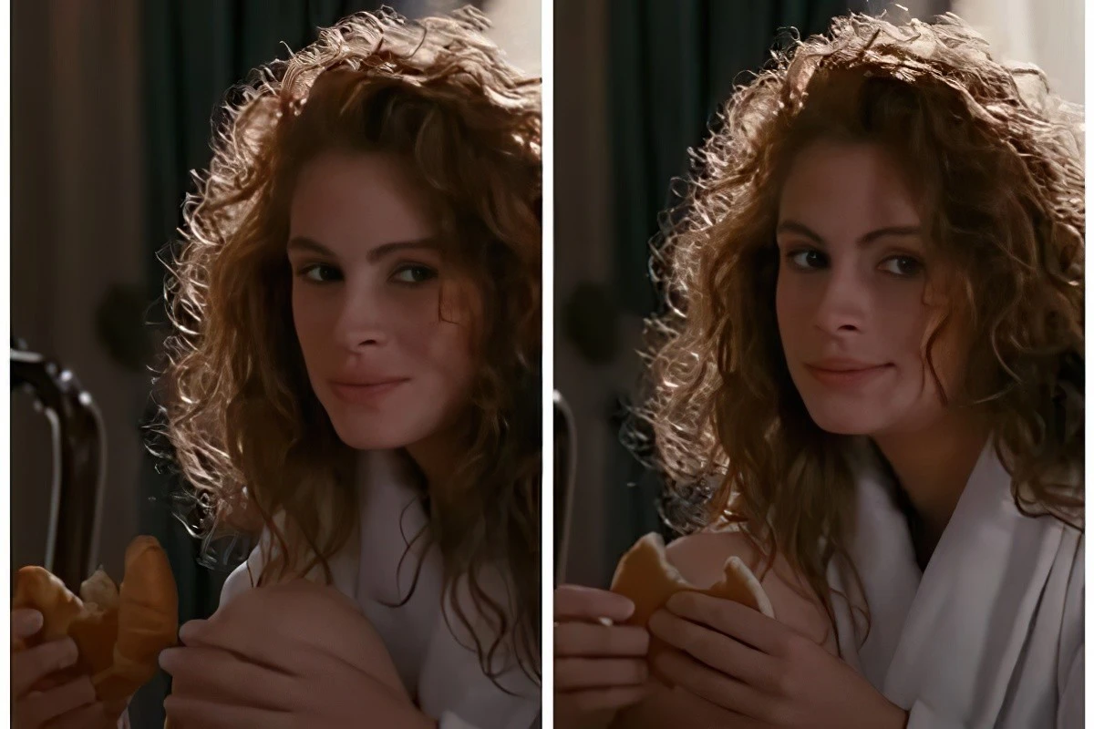 1. «"Красуня". Під час сцени, де Джулія Робертс снідає, вона надкушує то млинець, чи то круасан. Ніби не може визначитись»