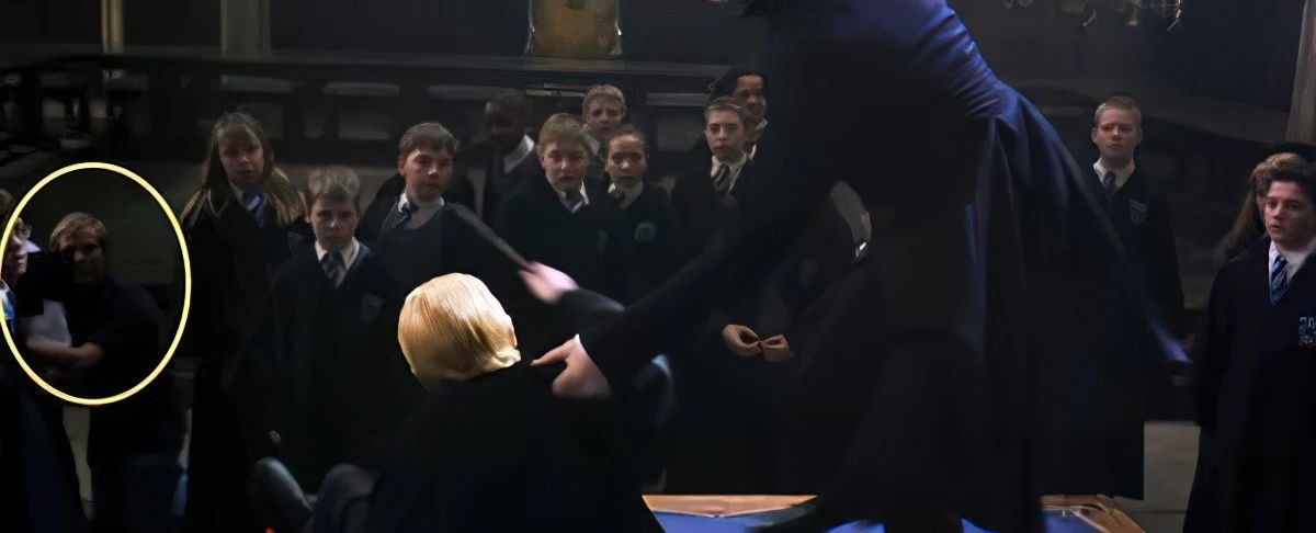 8. "Гаррі Поттер і Таємна кімната". Під час дуелі Гаррі та Драко, коли Снейп допомагає Драко піднятися, на задньому плані серед учнів можна побачити члена знімальної групи з камерою»